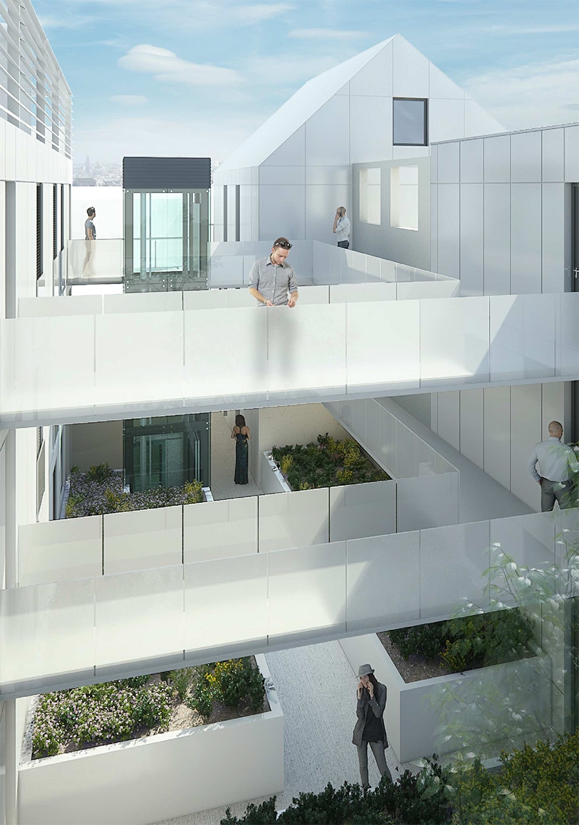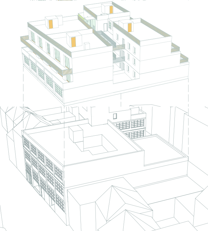 Ouverture du cœur du bâtiment pour permettre l’implantation de logements traversants et création d’une cour intérieure végétalisée comme élément de qualification résidentielle. Extension dans le prolongement du bâti existant comme élément de mise en valeur du patrimoine industriel.