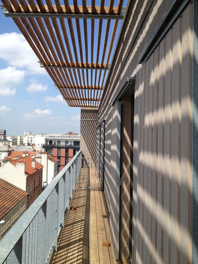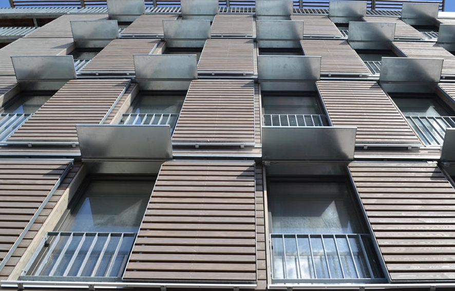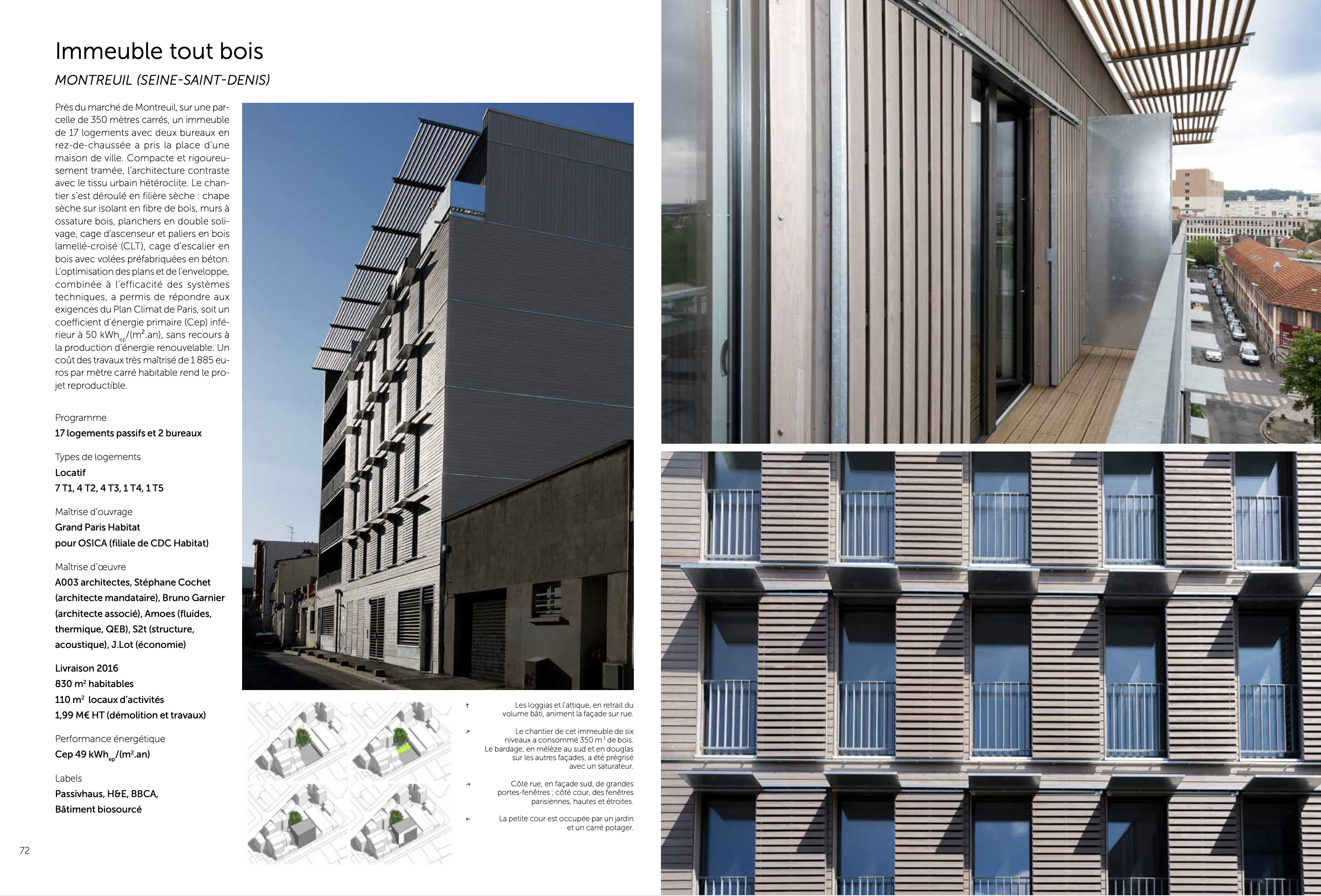 Parcelle à l’alignement sur rue étroite (9,00m de large), orientation Nord Sud. Construction de 17 logements et 2 commerces, sur deux parcelles réunies. Construction en filière sèche complète en technique ossature bois et planchers à double solivage avec chapes sèches, sur 6 niveaux. Cage d’ascenseur en CLT. Murs finis d’usine intégrant les menuiseries extérieures, le bardage, les isolants, la serrurerie. Clos Couvert réalisé en 8 semaines. Bardage bois prégrisaillé. Bâtiment Passiv Haus équipé d’une ventilation double flux à récupération de chaleur, récupération de chaleur sur EU, mini chaufferie Gaz de 10kW en ECS et chauffage pour 17 logements. Pas de radiateur en logements (menuiseries triple vitrage). Toiture terrasse « cool roof », végétalisation de la façade nord et création d’un jardin partagé comestible. Plantation d’un poirier.