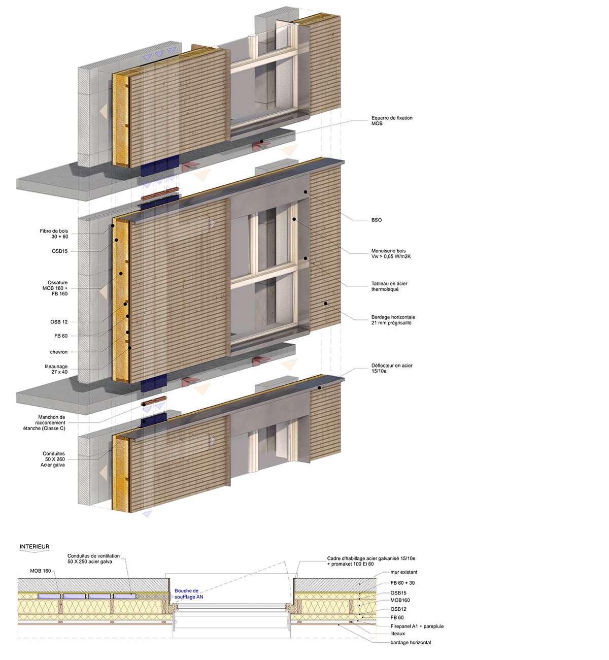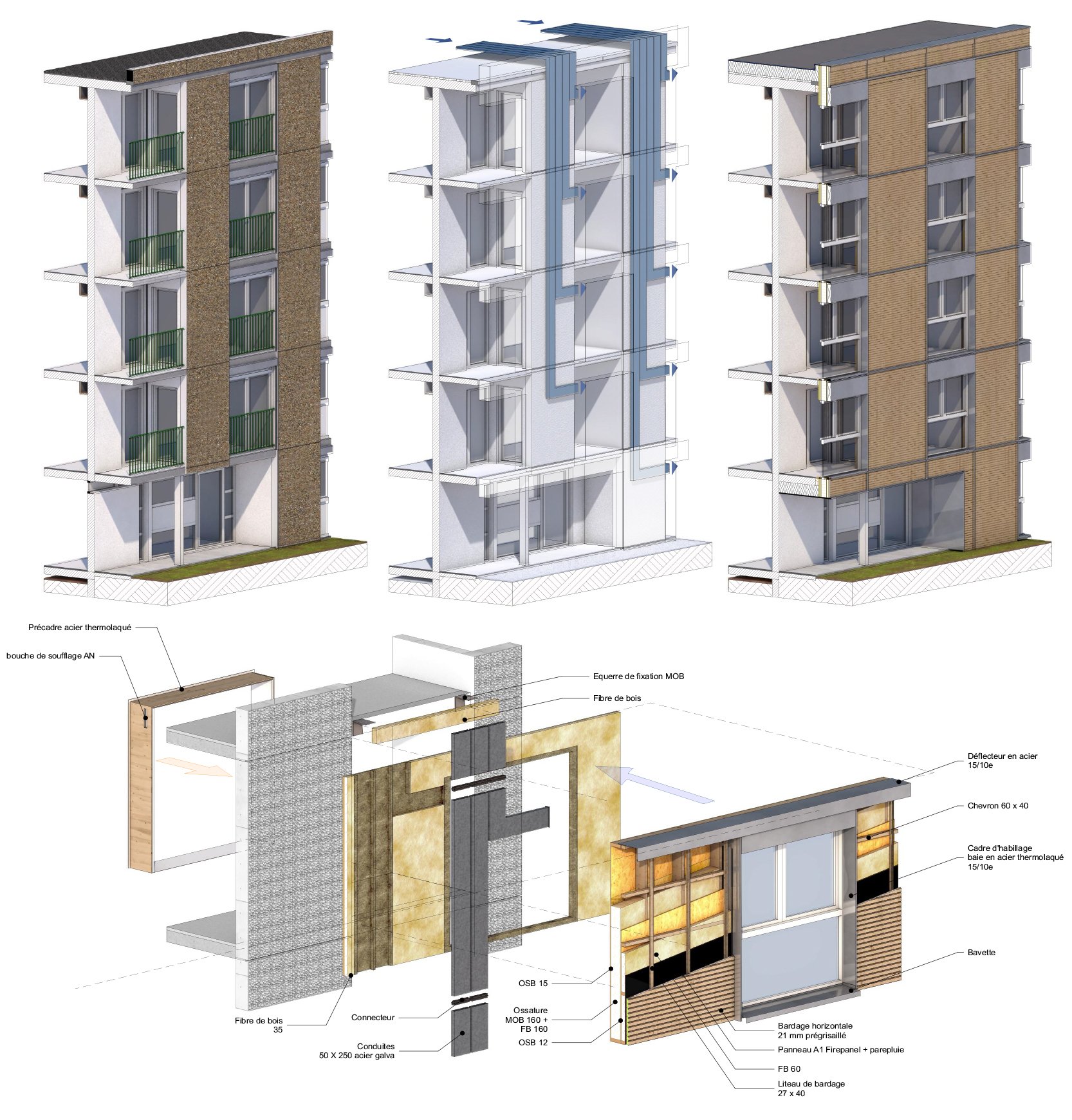 Bâtiments plots alignés sur l’avenue principale multi-orientés. Construction de 63 logements collectifs (3 bâtiments), 1LCR, 1 loge centrale, 1 local commercial. Qualification de la façade du quartier sur l’entrée de Ville. Construction en filière sèche complète en technique ossature bois et planchers à solivage à petite section sur sommiers, chapes anhydrites. Cage d’ascenseur en CLT. Socle à RdC en béton. Murs finis d’usine intégrant les menuiseries extérieures, le bardage, les isolants, la serrurerie. Balcons sur tirants préfabriqués. Bardages bois prégrisaillés, bardage métallique et double mur brique à RdC. 3 traitements différenciés des bâtiments en isolation et inertie relative : laine de verre vs fibre de bois, 2xBA18 en doublage vs 1xBA18. Bâtiment en conception Passiv Haus équipé d’une ventilation double flux à récupération de chaleur, raccordé sur puit canadien hydraulique en rafraichissement. Pas de radiateur en logements (menuiseries triple vitrage). Toitures terrasses « cool roof ». Stationnements extérieurs perméables. Gestion des EP à la parcelle (noues), végétalisation de façade, label Eco-jardin et BiodiverCity (site classé en ZNIEFF et réservoir de biodiversité).