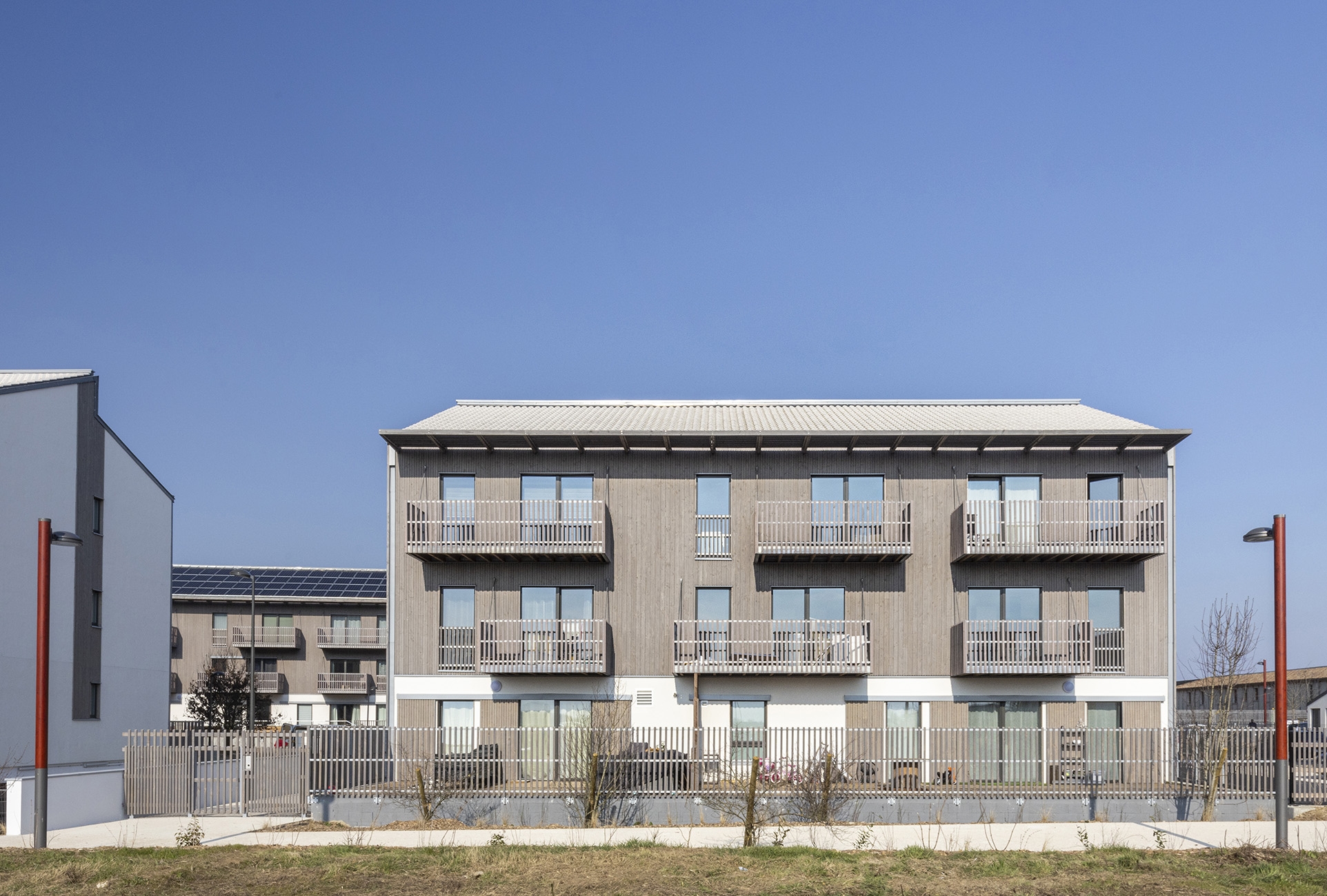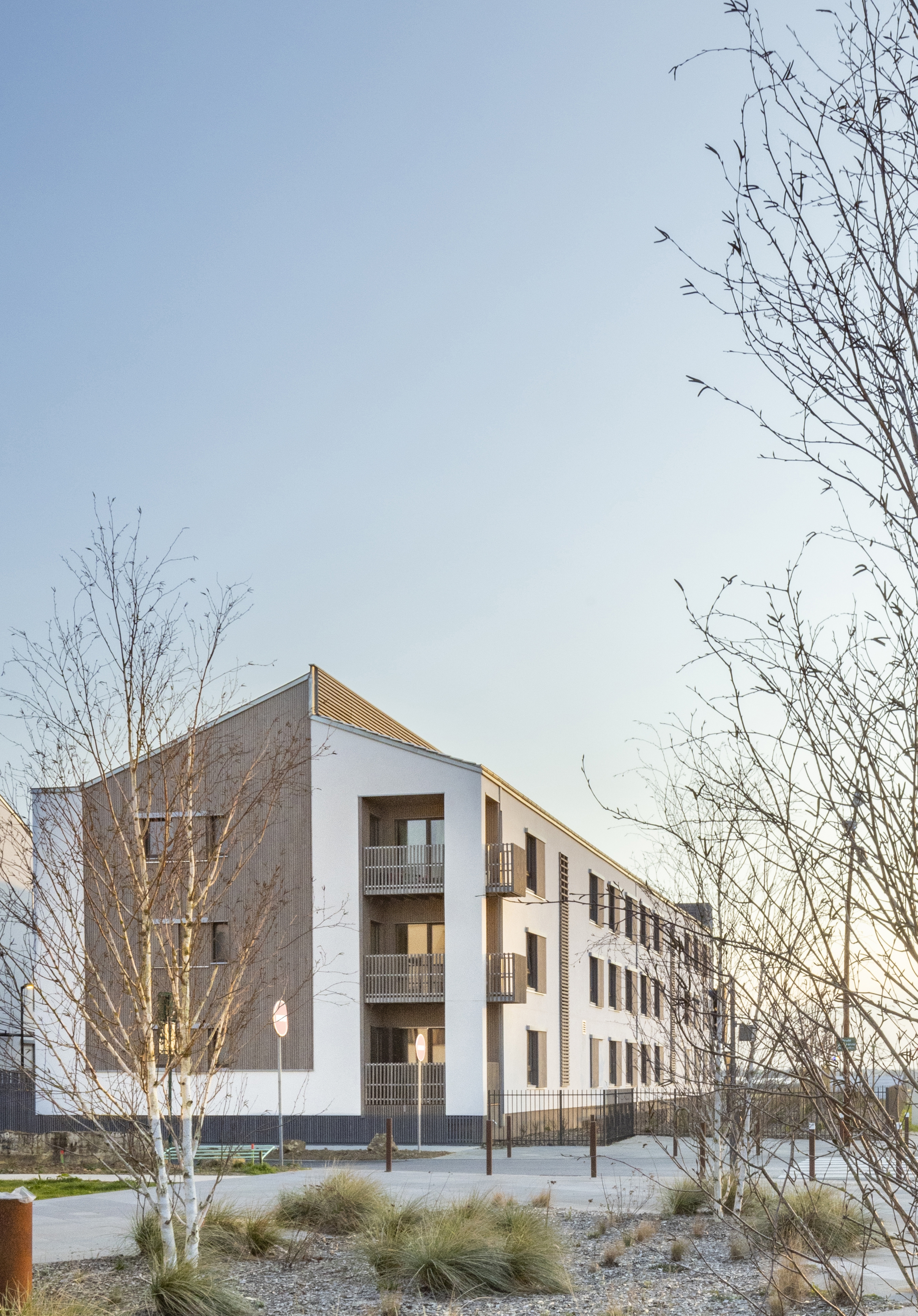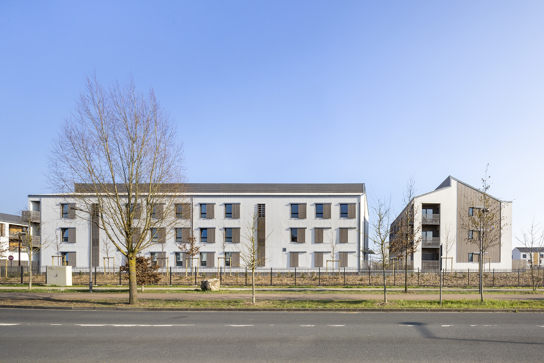 Parcelle d’angle en façade sur l’avenue en Entrée de ville, plan en U, orientations Sud-Est et Sud-Ouest. Construction de 48 logements collectifs (4 bâtiments et 6 cages d’escalier) et 10 maisons individuelles accolées en 4e couronne, ZAC du Chêne Saint Fiacre lot CHE2-B, en entrée de Ville de Chanteloup en Brie. Construction en filière sèche complète en technique ossature bois et planchers à solivage avec chapes anhydrites. Cage d’ascenseur en CLT. Parking semi enterré de 60 places et aménagements extérieurs avec traitement de la terre en place à la chaux. Murs finis d’usine intégrant les menuiseries extérieures, le bardage, les isolants, la serrurerie. Bardages bois prégrisaillés et enduits ITE sur fibre de bois. Bâtiment en conception Passiv Haus équipé d’une ventilation double flux à récupération de chaleur et mini chaufferie Gaz de 10kW en ECS et chauffage pour 8 logements par cage. Pas de radiateur en logements (menuiseries triple vitrage). Toiture à deux pentes « brisées » en tuile « cool roof » à engobe blanc. Noues, végétal local, plantation d’un chêne à haute tige.