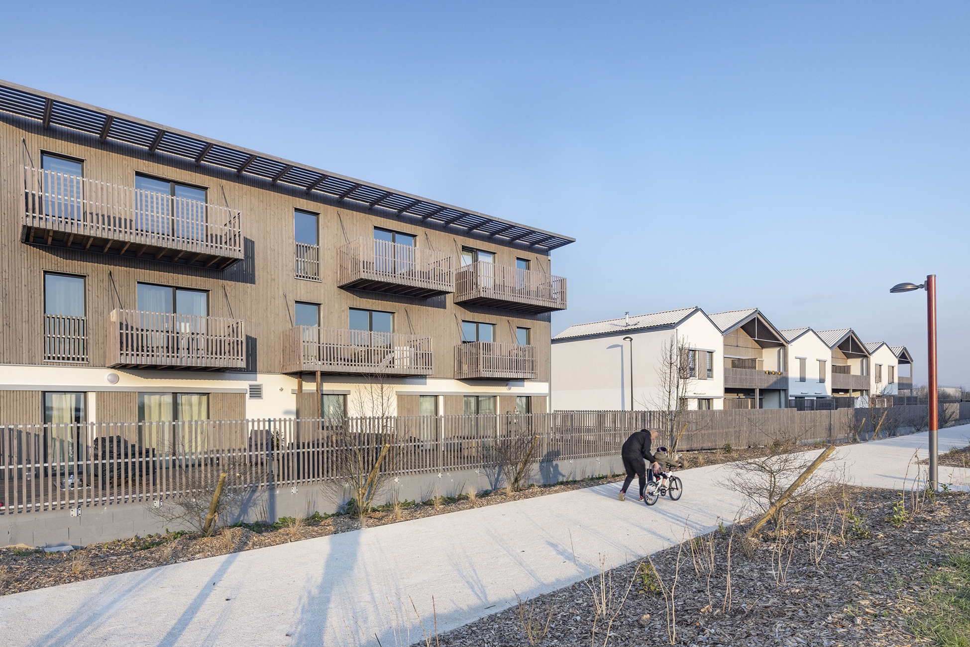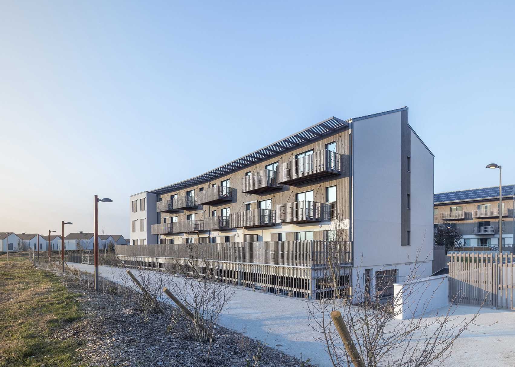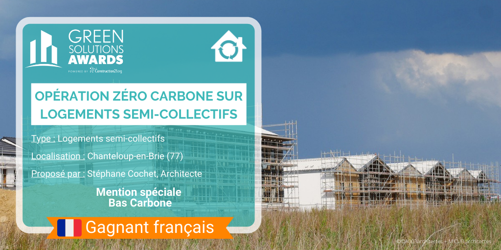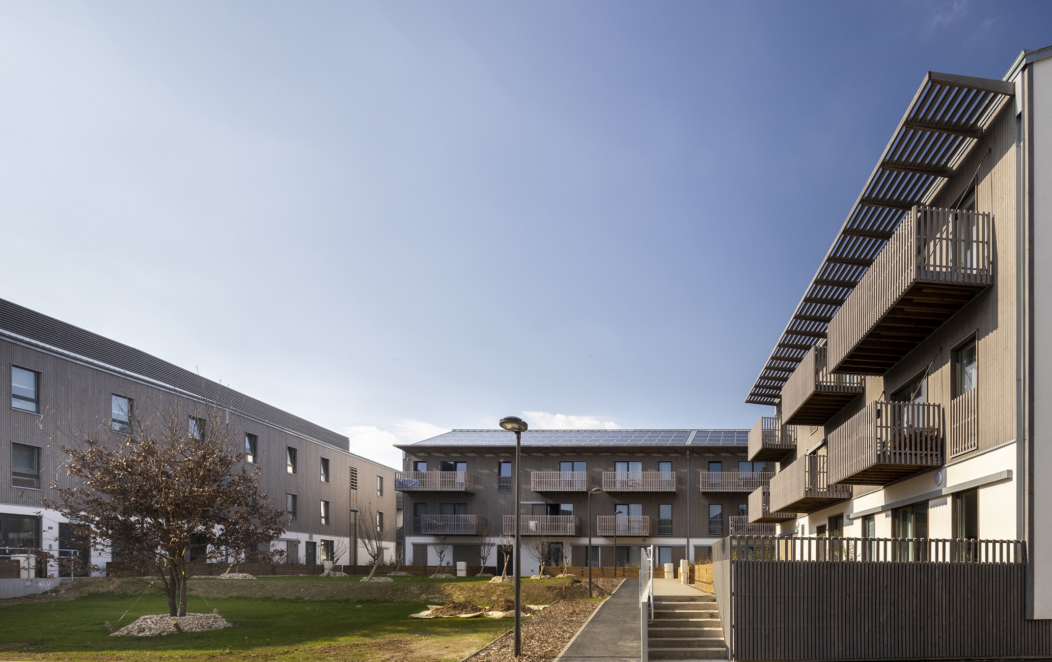 Parcelle d’angle en façade sur l’avenue en Entrée de ville, plan en U, orientations Sud-Est et Sud-Ouest. Construction de 48 logements collectifs (4 bâtiments et 6 cages d’escalier) et 10 maisons individuelles accolées en 4e couronne, ZAC du Chêne Saint Fiacre lot CHE2-B, en entrée de Ville de Chanteloup en Brie. Construction en filière sèche complète en technique ossature bois et planchers à solivage avec chapes anhydrites. Cage d’ascenseur en CLT. Parking semi enterré de 60 places et aménagements extérieurs avec traitement de la terre en place à la chaux. Murs finis d’usine intégrant les menuiseries extérieures, le bardage, les isolants, la serrurerie. Bardages bois prégrisaillés et enduits ITE sur fibre de bois. Bâtiment en conception Passiv Haus équipé d’une ventilation double flux à récupération de chaleur et mini chaufferie Gaz de 10kW en ECS et chauffage pour 8 logements par cage. Pas de radiateur en logements (menuiseries triple vitrage). Toiture à deux pentes « brisées » en tuile « cool roof » à engobe blanc. Noues, végétal local, plantation d’un chêne à haute tige.
